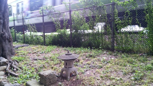 山手線・恵比寿~渋谷間の線路脇に、都会の片隅で忘れられたような小さな灯籠を発見。