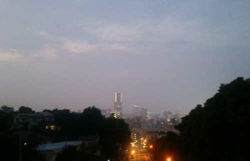 さて、写真は、坂の上から眺める夕暮れのランドマークタワーです。