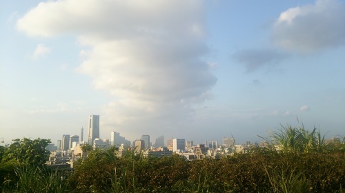 高台の公園から眺める夕暮れのランドマークタワーには、まだまだ夏の雲がかかっていますが、秋の気配が忍び寄ります。