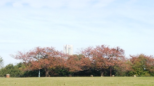まずは、色づく秋の桜の向こうに見えるランドマークタワー。