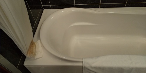 ホテルの浴室、いつものようにシャワーカーテンの端が折り込まれています。