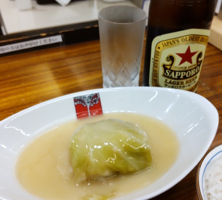 ロールキャベツとミートコロッケのセット 税込み1,130円 は、味も価格も心おどるメニュー。キャベツサラダにつけるリンゴ・ドレッシングの爽やかな酸味が旅の疲れをいやします。