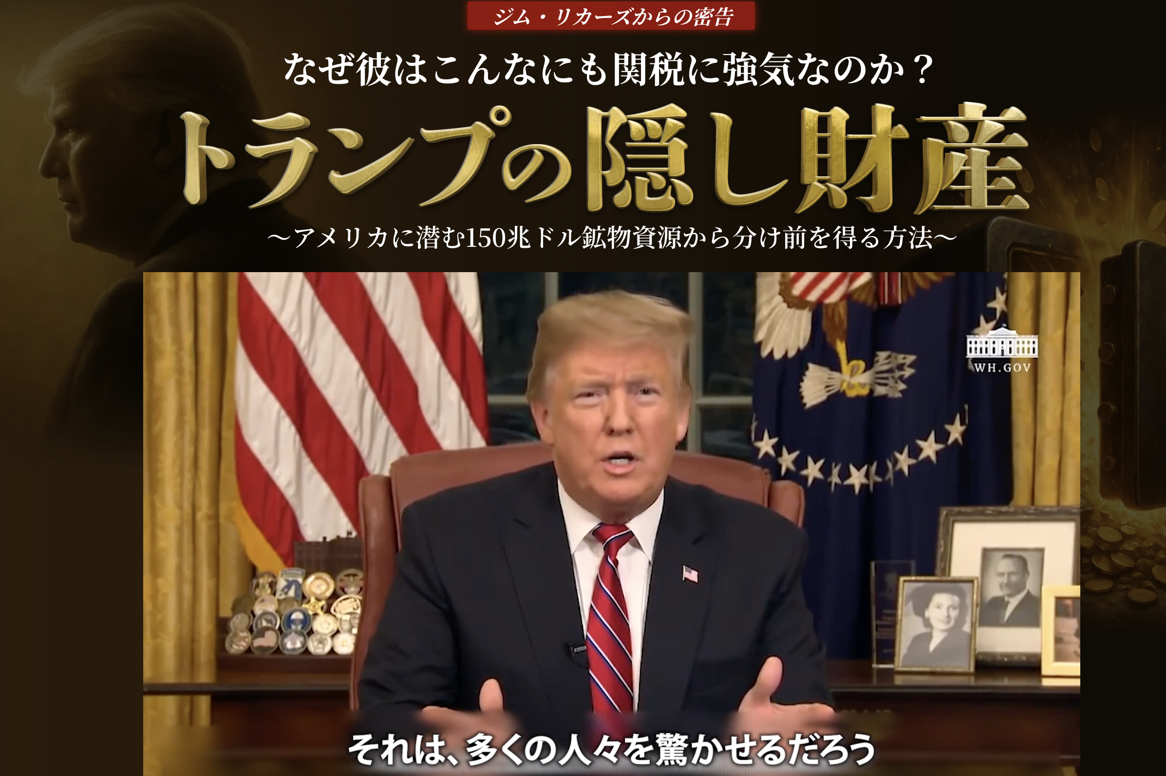 →公開中 トランプの「隠し財産」とは?ジム・リカーズ氏によると ──今、トランプ政権が この「宝の山」を解放しようと しているというのです。 Q:トランプ政権の真の狙いとは?「150兆ドル解放」の計画が本格始動する時、 巨万の富を手にするのは誰なのか? 関税の裏で動き出す、 21世紀のゴールドラッシュとは… この歴史的転換点を見逃さないでください。 詳しくはこちらから無料でご覧いただけます。