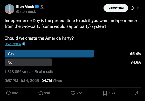 | この記事にあるように、あなたもイーロン・マスクの計画について聞いたことがあるだろう。 【イーロン・マスク氏、トランプ大統領に対抗するため「アメリカ党」を設立】 出所:news byte マスク氏は2028年の次期大統領選挙に向けて第三政党を結成し、早ければ2026年の中間選挙で共和党と民主党に対抗する候補者擁立計画を立てている。 新党の名前は、「アメリカ党」である。 マスク氏が動いたのは、自身がX(旧ツイッター)で実施した世論調査で、アメリカ人は2対1の差で新党を望んでいるという結果からだった。
