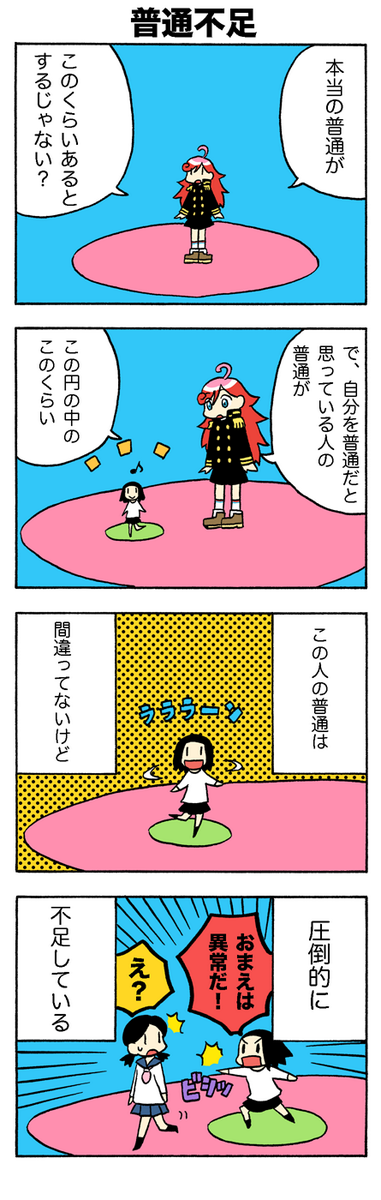まぁ「何を以ってして『普通』なのか」「普通じゃないのは悪いことなのか」ってのがそもそも問題ではあるけどな。「普通=多数派の思想」とすると、コミュニティによっては「大きい範囲の世間一般から見ると異常だけど、そのコミュニティの中では普通」とかその逆とかざらに出てくるし