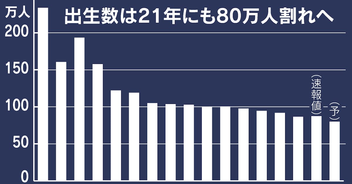 2021年は、出生数が80万人をきりそうで、予測より10年以上早い。