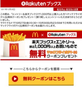 無料マックポテトが届いた☆楽天ブックスキャンペーン現在も第2弾が行われてます。 エントリー&楽天ブックスで1,000円以上購入した方へマックフライポテト(S)無料クーポンプレゼント ネットビジネスブルークマにも記事あげましたが 第一弾で書籍を買ったのでメールが届きました ということで明日おみやげに買っていこう