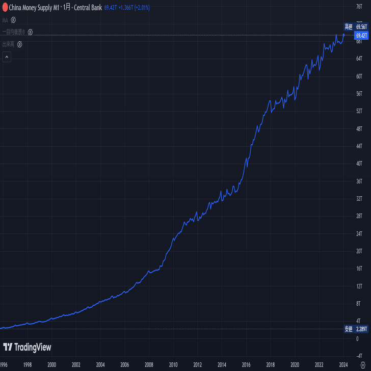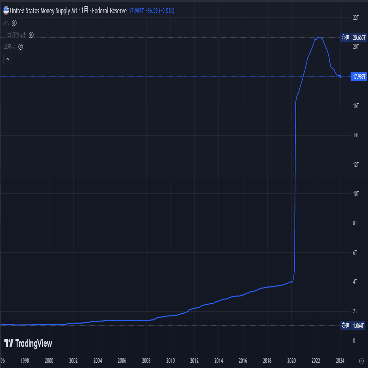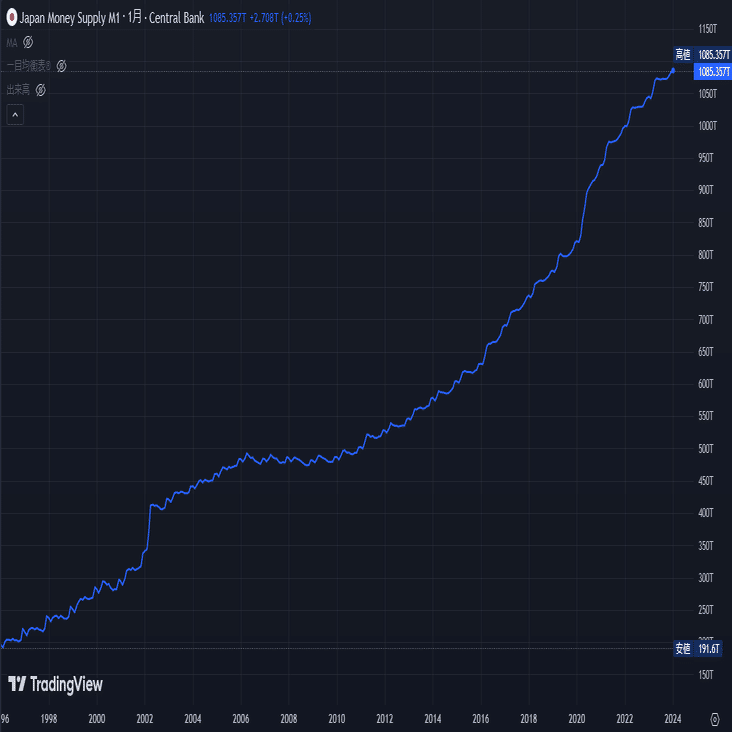 マネーサプライ(M1)指標でも比較してみる。なお、日本においてはマネーサプライからマネーストックへと現在は変更されている。