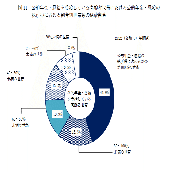 高齢者世帯の中で、その6割が給付を頼りに生活していることがわかる。さらに、その4割が100%、給付に頼っていることがわかる。