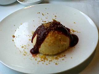 上に甘酸っぱいラズベリーのソースが掛かっています。