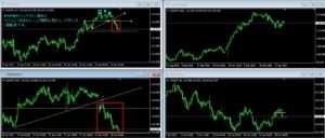 1時間でトリプルトップ完成後、トレンドラインを下抜けして、一時的に、「これ以上上に行きません!」と言ってるようなトレードポイントになります。