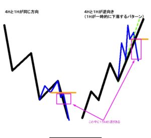 具体的に説明すると、下図の左のように4時間足と1時間足が下降トレンドなら、波を作ろうが作らまいがエントリーしていいことになります。