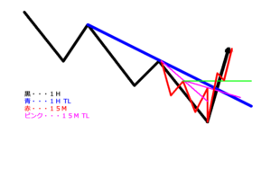 と言う事は、下図のように1HのTLが引ける中で、15MのTL(ピンクライン)が何度も引けるところが現れます。