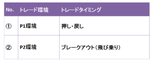 水平線理論では、【トレード環境×タイミング】は以下、4つ組み合わせがありますが、スキルを最速で効率的に安定化させるには、【P1環境×押し・戻し】の1パターンに絞った方がいいです。