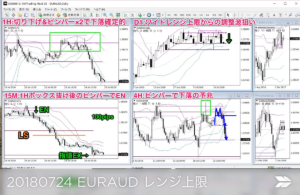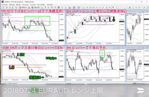 日足ワイドレンジ上限の重要抵抗付近で、4Hの大きなピンバーで下落の予兆があり、1Hでピンバー2本のダブルトップが完成が見られたので、1Hのボックスレンジ抜けからEN。