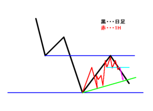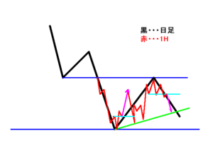 実は、この部分、日足の下降ダウの一部という背景があるから、しっかり狙えるポイントなのです。