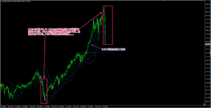 トレードポイントは下図の200pipsぐらいですが、指標を挟んで、更に500pipsぐらい下がりました。。。(汗)