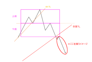 当然、そこには、日足TLが存在することになり、必然的に、4H下段と日足TLが同時に交わるような所をエントリーポイントとしてマークすると、ピンポイントで綺麗に取れるようになります。