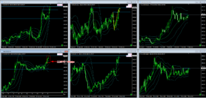 一般的に、V字完成を目指して、下から強い上昇トレンドで上がってくる波は、V字完成後、この2パターンで遷移するのですが、昨日のマーケットは、パターン1の、「V字完成付近の抵抗から反転するパターン」のイメージになりましたね。