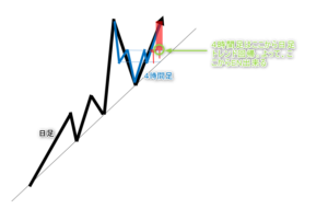 その部分で、1時間足(or 15分足)がV字で戻ってくれば、4時間足ローソク足の髭となり、4時間足のレジサポになるので、EN出来るようになります。