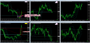 一般的に、下図の右側のように、日足トレンド環境での4時間足の折り返しトレードはあまりしませんが、昨日は1時間足が下段→上段へと順序良く上昇して来たので、こういう分かり易い流れの時は、参戦するようにしています。