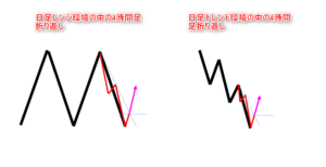尚、図の左側のように、日足レンジ環境での4時間足の折り返し部分は良くトレードします。