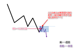 よって、現在、上で浮遊している4Hは、徐々に浸食されて、下落し、日足レンジに入ってから、週足の下降トレンドへと回帰していくかもしれません。