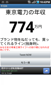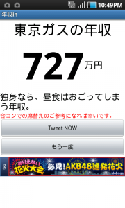 次に調べたのは、いま話題のこの会社「東京電力」→774万円。ついでに「東京ガス」も→727万円。よくテレビでは東京電力の年収が槍玉にあがっていたが、東京ガスもそれに迫る金額だ。どうりで電気料金とガス料金が高いわけだ。