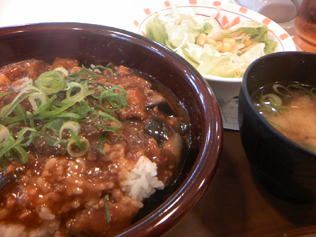 で、帰宅して寝る前に、麻婆茄子丼サラダセット大盛。