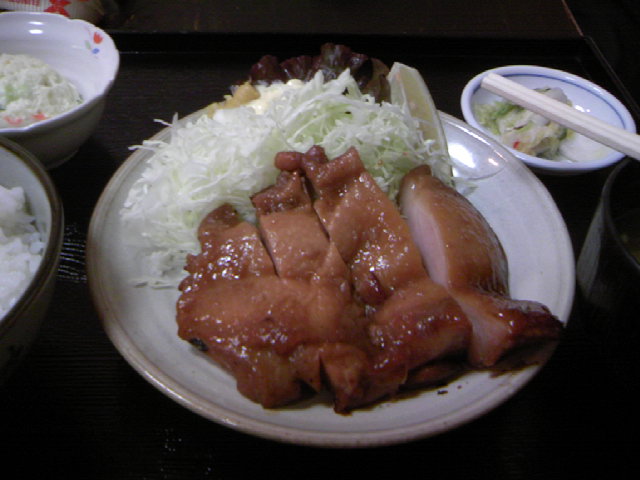 で、会社の人達と、鶏照焼き定食。