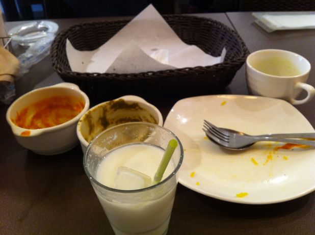 ランチ終了 ナン二枚とカレー2種類、サラダにサフランライス、そしてラッシー。 これで1000円行かずっ 大満足でした~^^