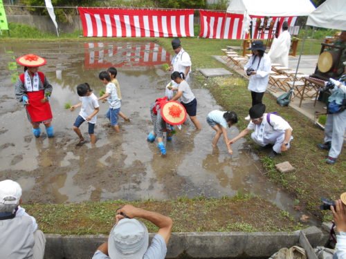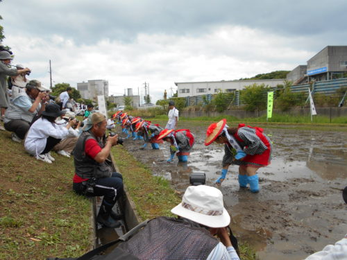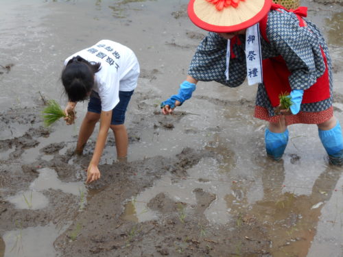 関西福祉大学学生の早乙女達の手で丁寧に苗を植えます。