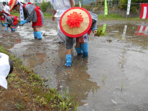 初めて入るであろう田んぼに、足を取られながらの田植えは