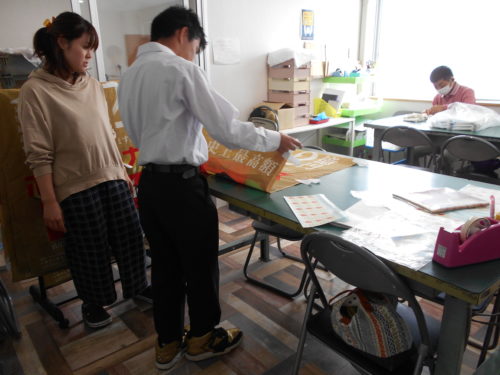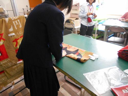 のぼり旗を畳んで、袋に入れる作業を体験して頂きました。