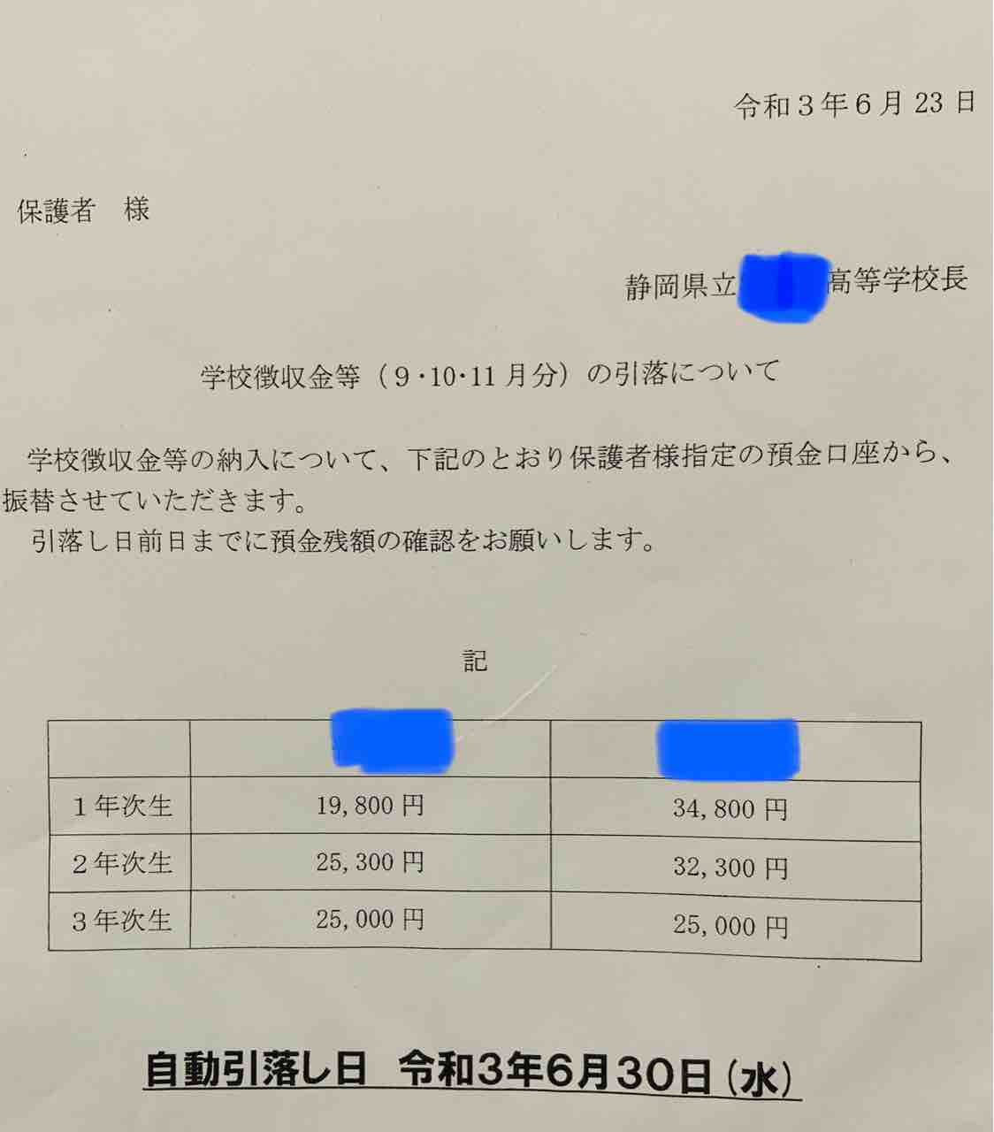 そこで、妻にお願いして、長女の私立高校の徴収金を調べてもらう。