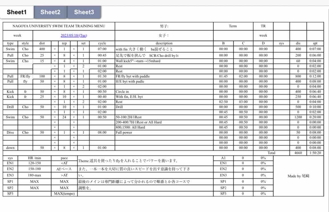 pullでパドル付きのflyは水がめちゃくちゃ重くなり、腕がパンパンになりました。メインのメニューは距離ごとで分かれましたが、僕は200〜400のコースをやりました。1セット目は31.32秒でそろえれましたが、そこからバテまくったので目標を全部30秒にしてそれをできるように頑張りたいです。今度東国で2フリに出るのでとてもいい練習になりました。お疲れ様でした!