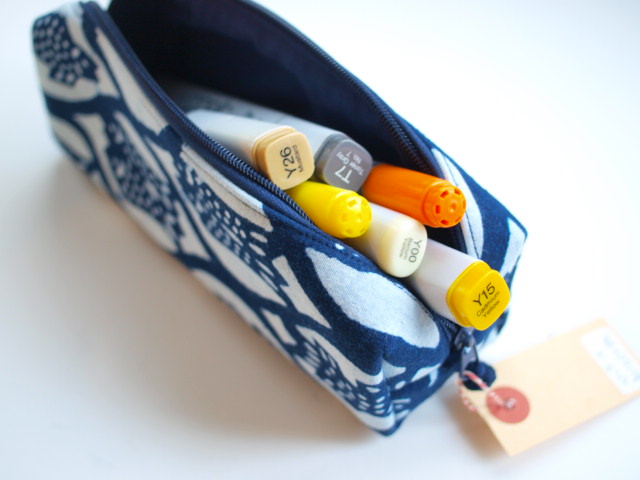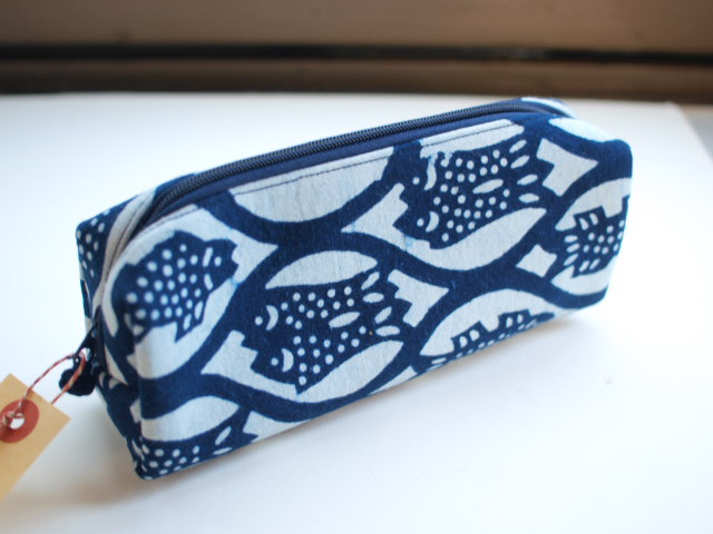 藍染のペンケース。お魚柄が可愛いです。大きめなので10本くらい入ります。