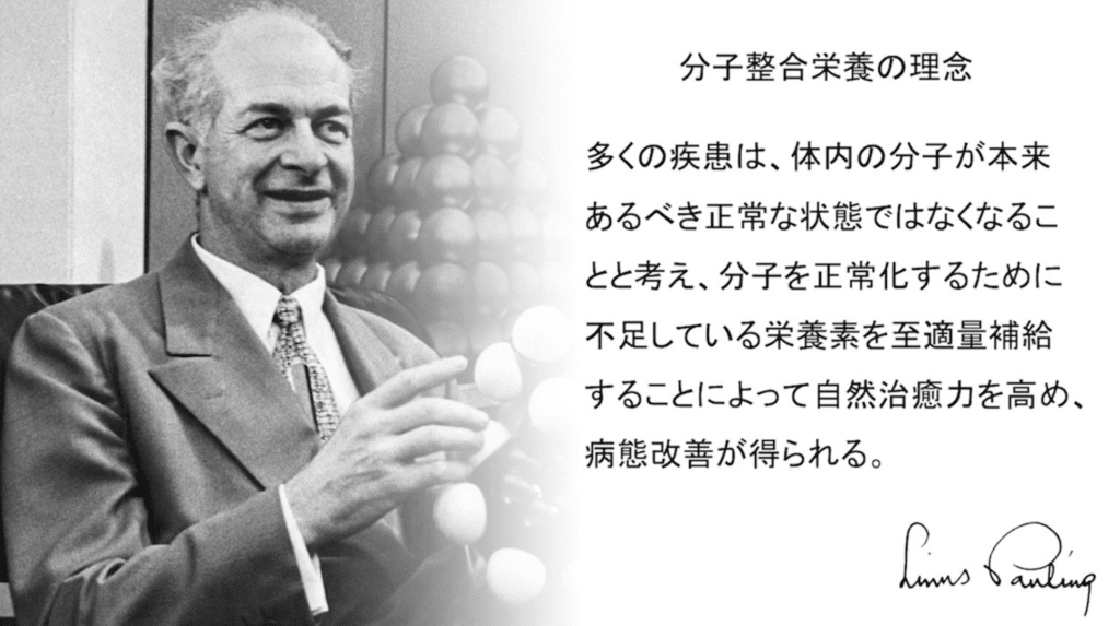 それ以降、ポーリング博士は自身の研究を通じて「生体内の分子の乱れが病気の発症に関与しているのではないか」と考えるようになります。そして、前述した「多くの疾患は、体内の分子が本来あるべき正常な状態ではなくなる事と考え、分子を正常化するために不足している栄養素を至適量補給することによって自然治癒力を高め、病態改善が得られる」事を提唱したのです。