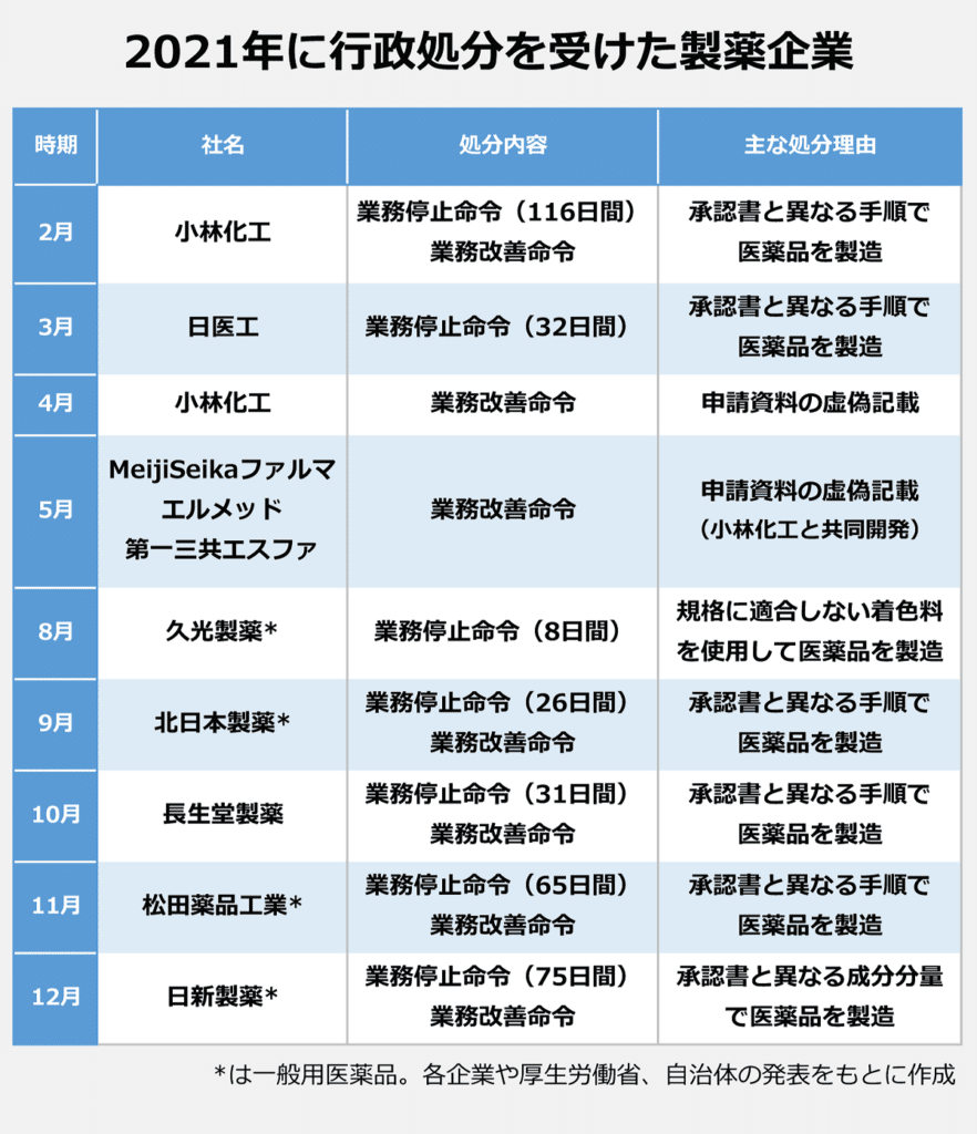 他にも、大手のジェネリック医薬品メーカーの不祥事は相次いで発生していて、2021年に行政処分を受けた製薬企業はなんと9社にも上っています。