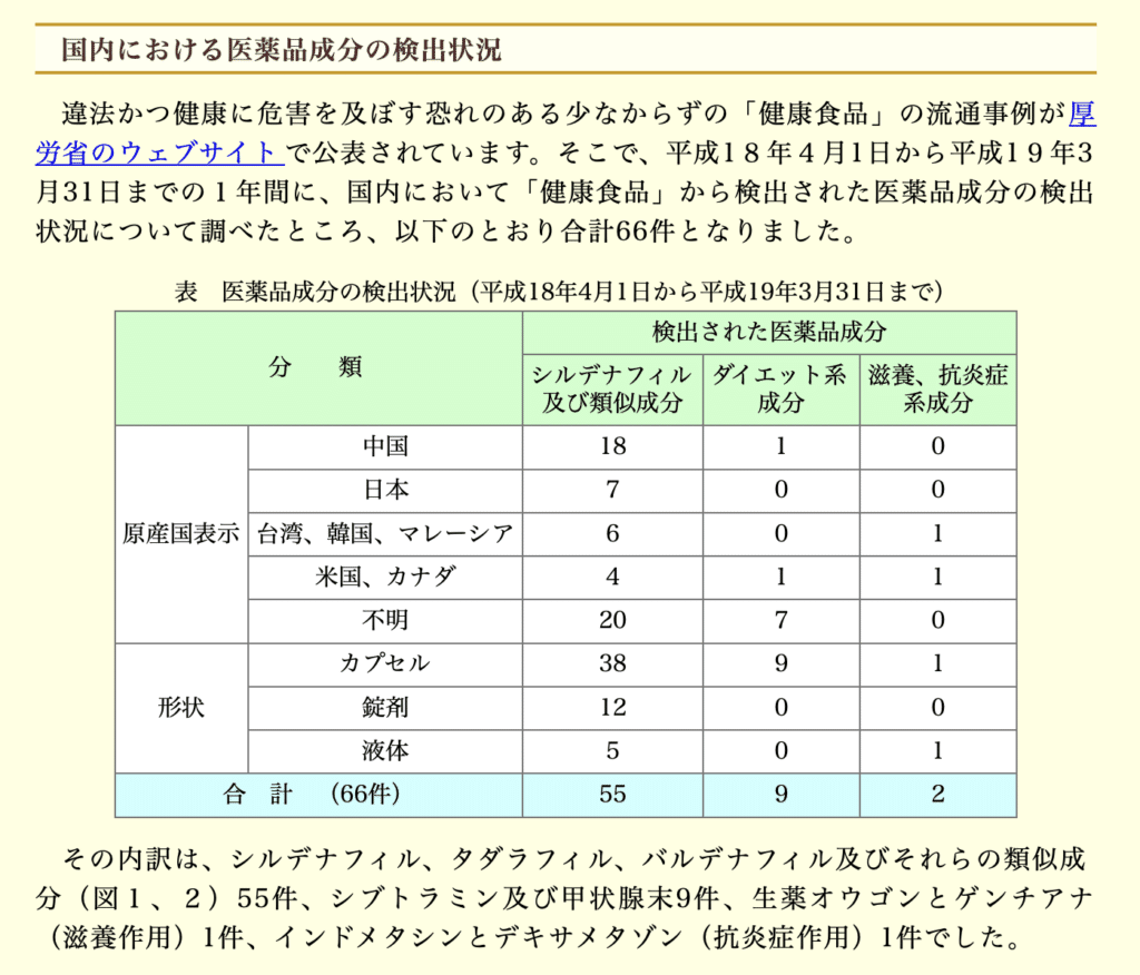 この他にも、愛知県衛生研究所が平成18年4月1日から平成19年3月31日までの一年間で、国内で販売された健康食品の成分を調べた結果、66のサプリメントから医薬品成分が検出されたとの結果が出ました。