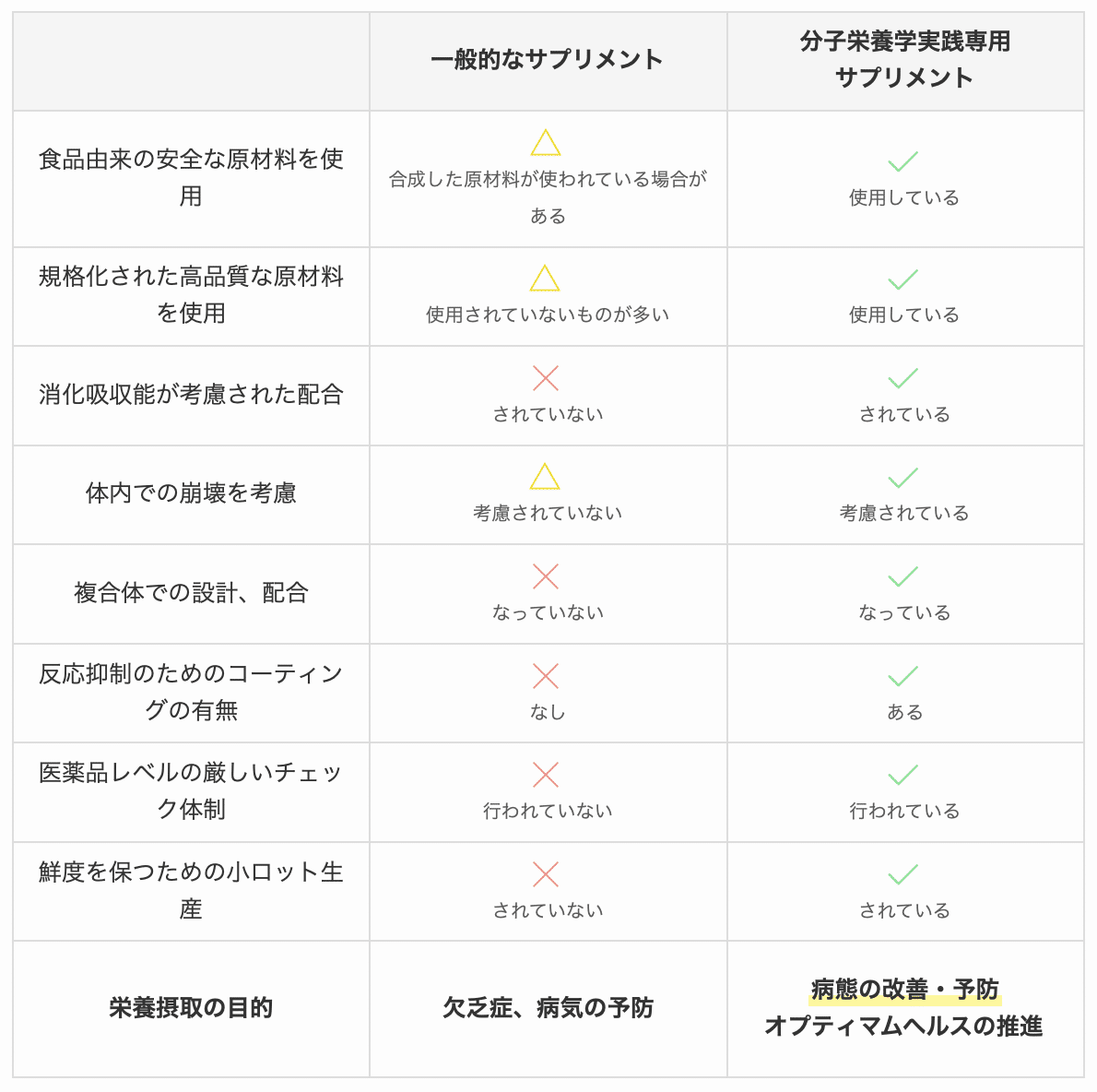 同じように見えるサプリメントでも、含まれている栄養成分や使われている原材料には大きな違いがあります。また、それによって得られる結果も変わってくる恐れがありますので、分子栄養学を実践する際は必ず分子栄養学実践専用サプリメントを使用するようにして下さい。