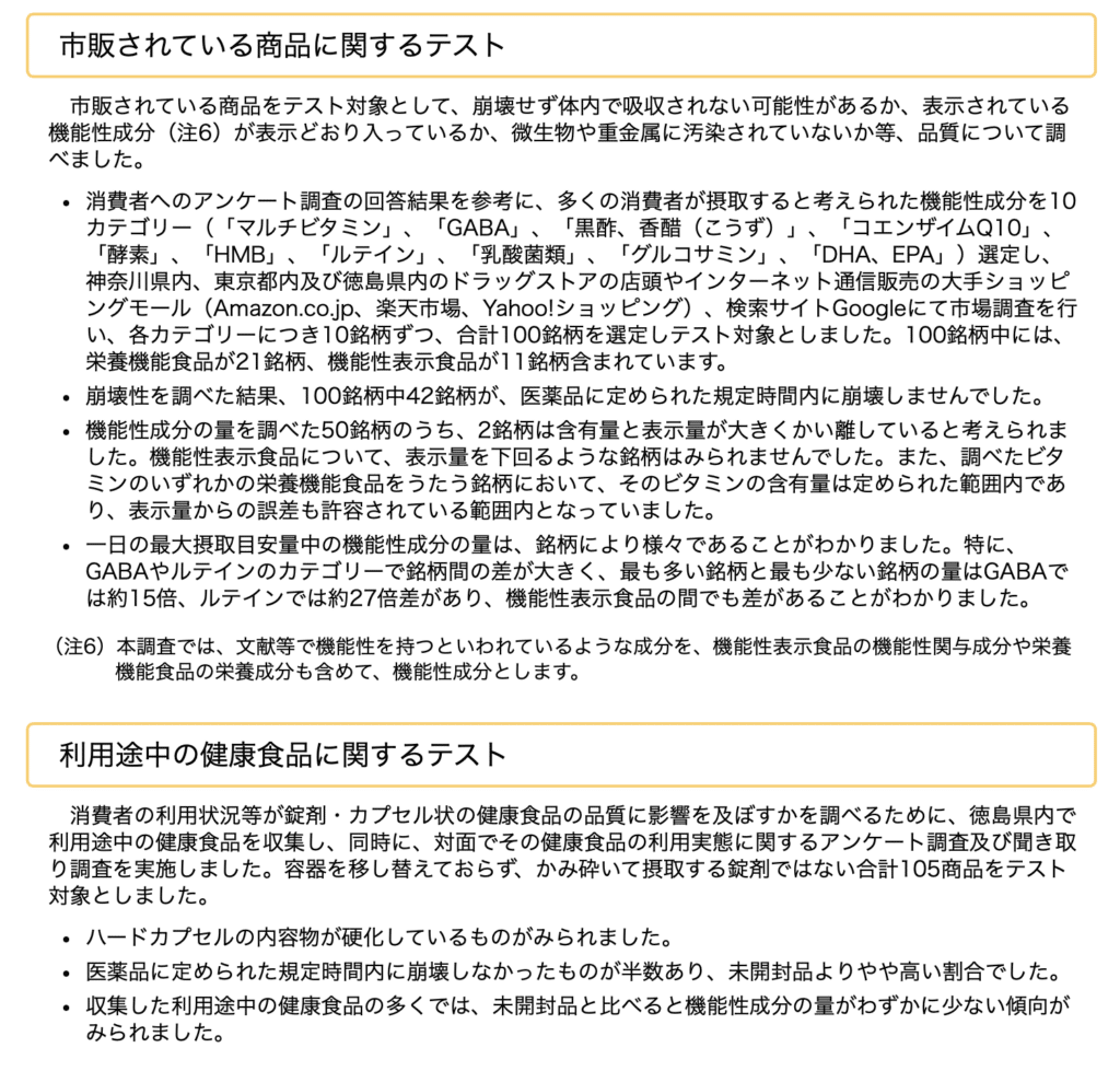 市販されている商品をテスト対象として、崩壊せず体内で吸収されない可能性があるか、表示されている機能性成分(注6)が表示どおり入っているか、微生物や重金属に汚染されていないか等、品質について調べました。