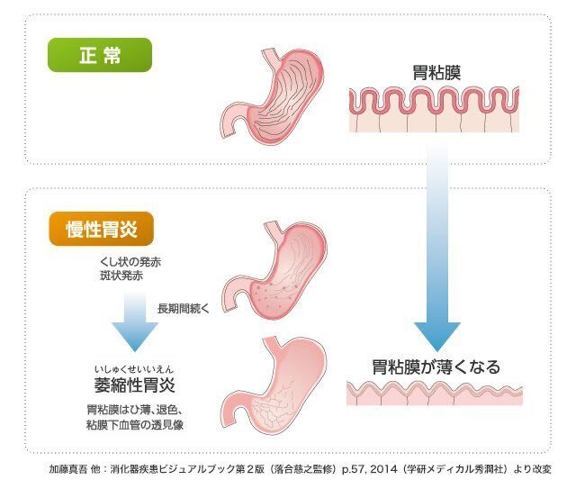 この消化吸収能が低下してしまう主な原因が、ピロリ菌の感染による「慢性胃炎」「萎縮性胃炎」です。
