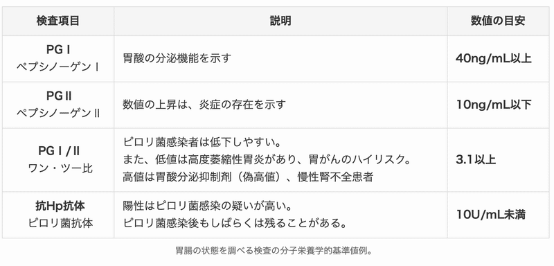 例えば、健康な人であればPG1が50、PG2が5といった感じに対し、ピロリ菌に感染している場合はPG1が20、PG2が10のようにPG1が減少、PG2が上昇します。このPG1の数値からPG2を割るとPG1/2比となり、この数値が3.1を下回るようなら胃粘膜に萎縮が起きている可能性が高いです。(例 50÷5=10、20÷10=2)