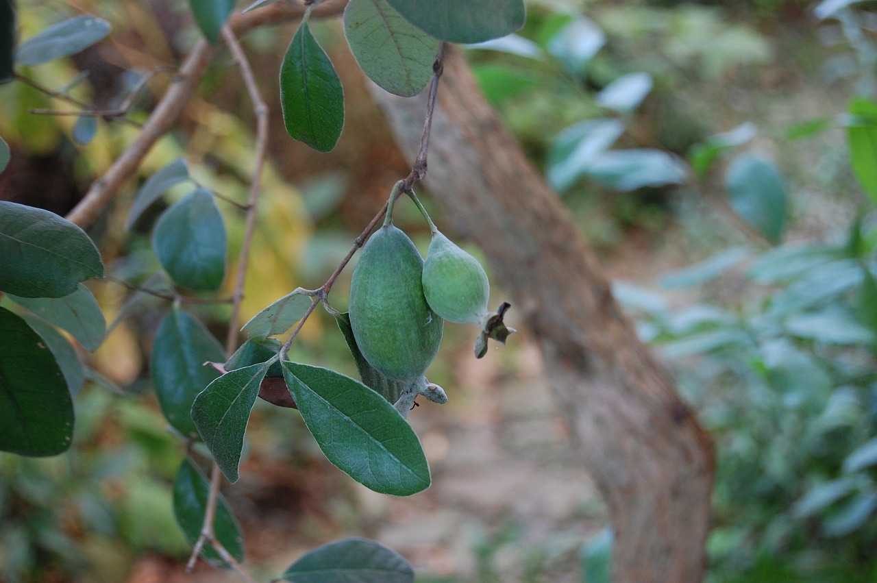 これ、フェイジョアの実なのですが、今年で45周年を迎えた私の結婚生活の2年目に種から育てたものにもかかわらず、今年初めて実がなったのです。