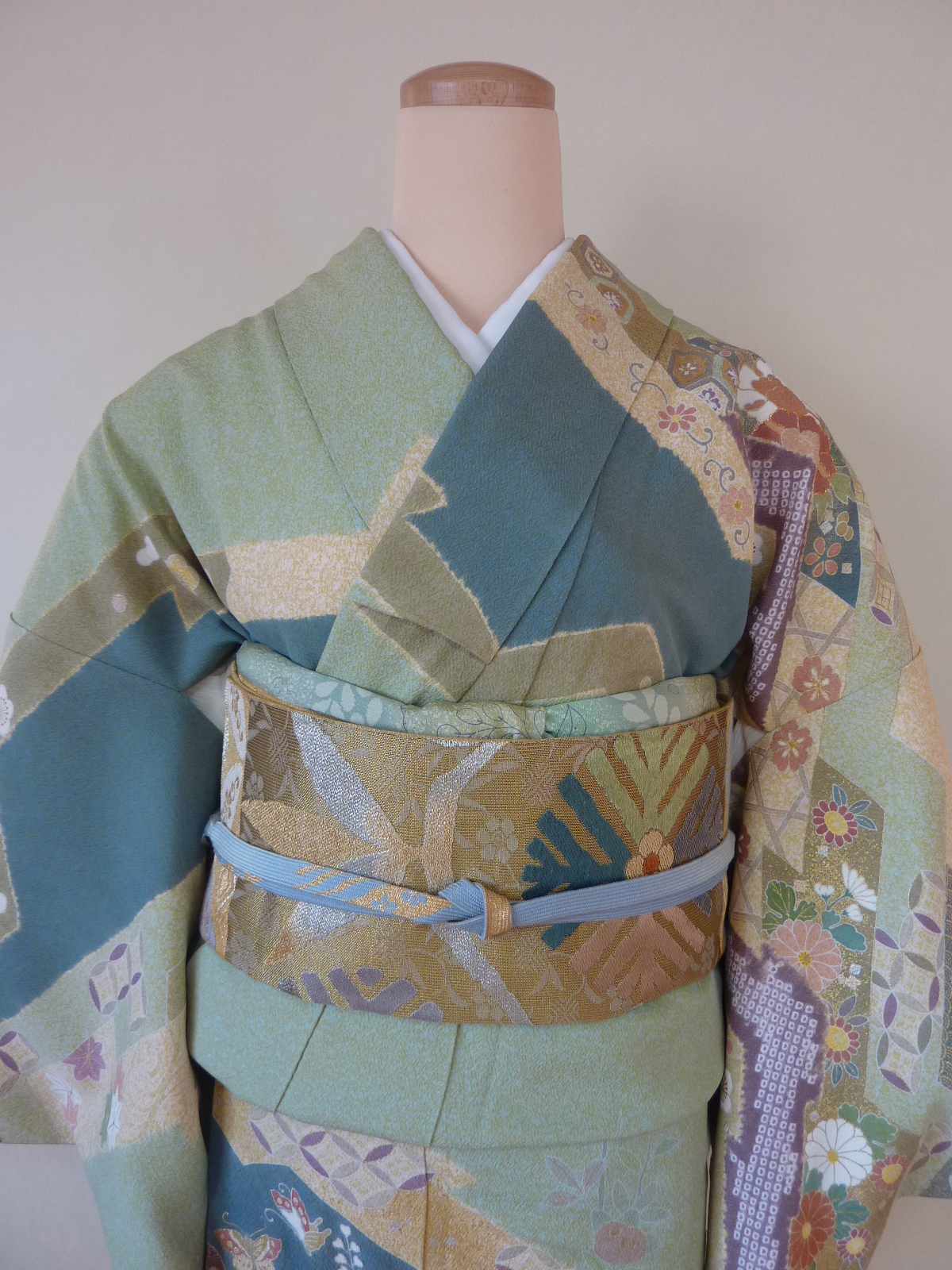 重ね衿の若草色が 全体をきゅっと引き締めているコーデです。