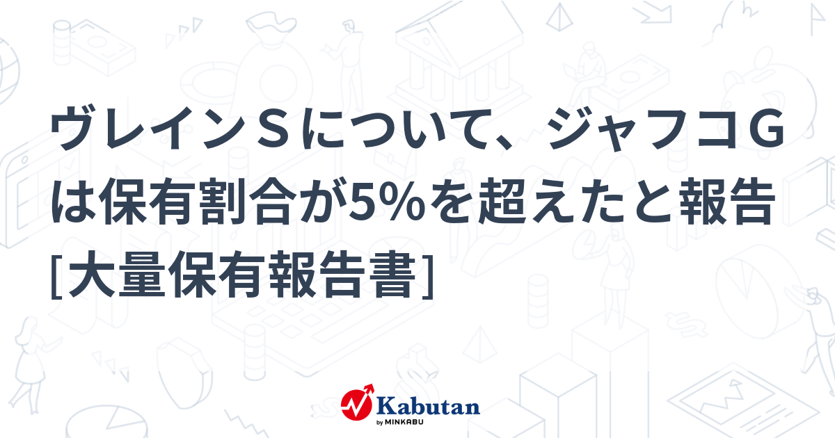 202403012024/03/01の新規大量保有・2831はごろもはごろもについて、大塚一男氏は保有割合が5%を超えたと報告 [大量保有報告書]はごろもフーズ [東証S]について、大塚一男氏は3月1日受付で財務省に大量保有...s.kabutan.jp※山本さんから大塚さんへ?・135AヴレインSヴレインSについて、ジャフコGは保有割合が5%を超えたと報告 [大量保有報告書]VRAIN Solution [東証G]について、ジャフコ グループs.kabutan.jp※昨日に続き、新規保有報告・9159WTOKYOWTOKYOについて、DLEは保有割合が5%を超えたと報告 [大量保有報告書]W TOKYO [東証G]について、ディー・エル・イー [東証S...s.kabutan.jp・6469放電精密加工研究所放電精密について、三菱重は保有割合が5%を超えたと報告 [大量保有報告書]放電精密加工研究所 [東証S]について、三菱重工業 は3月1日受...s.kabutan.jp※宇宙開発🚀以上