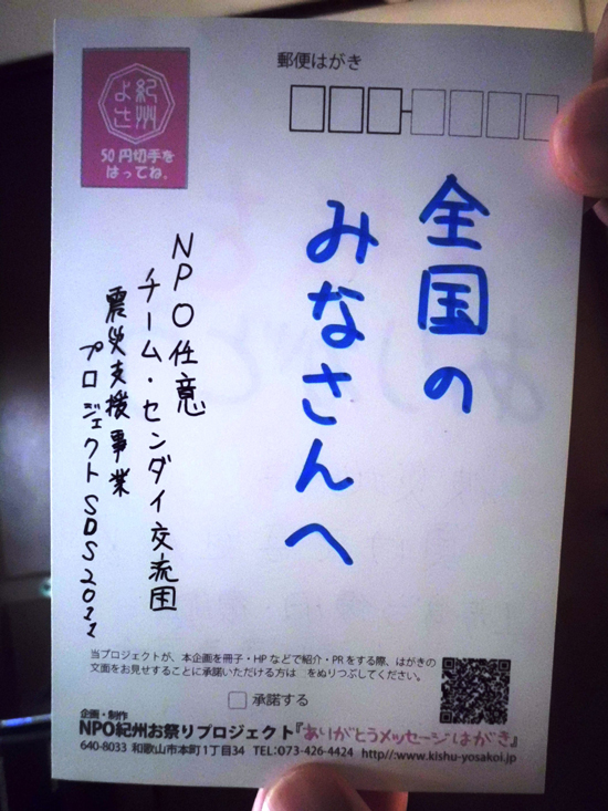 我々、被災者は、今を生活できているのは、ライフライン復旧当時から全国の皆さんに支えられているおかげです。その感謝をなかなか素直に口に出すことができない「ありがとう」という言葉を紀州よさこいがデザインされたハガキで3月9日(サンキューの日・ありがとうの日)に伝えられる企画に、即答で「参加します!」と伝えました。