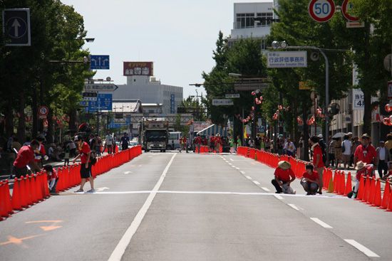 "おどるんや"の中でも特に熱い演舞が繰り広げられる会場「けやき大通り競演場」。その会場を安全に進めるのがパレード誘導なんです!横断帯・イス席への観客誘導や、地方車(音響・照明を積んだ車)と観客との接触を防ぐ「露払い」などがあります。特に地方車を間近で感じられるのは圧巻です!!