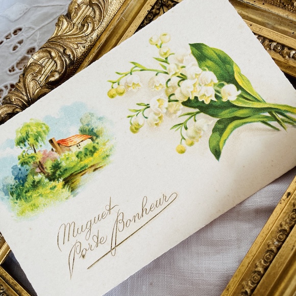 フランス アンティークポストカード 赤い屋根の家とすずらんと